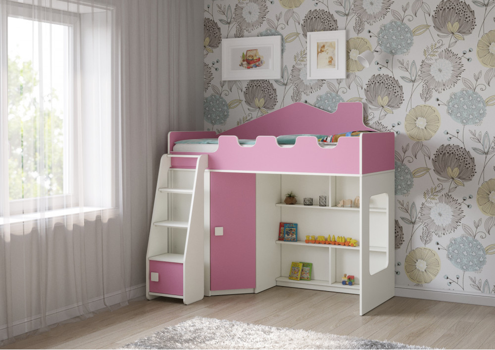 Отличительной особенностью данной модели является наличие прямой лестницы с дверкой, что добавляет элемент игры и позволяет ребенку легко и безопасно подниматься на свое спальное место. Угловой шкаф, расположенный на одном из фасадов кровати, предоставляет достаточно места для хранения одежды, игрушек и других предметов, которые должны быть под рукой.