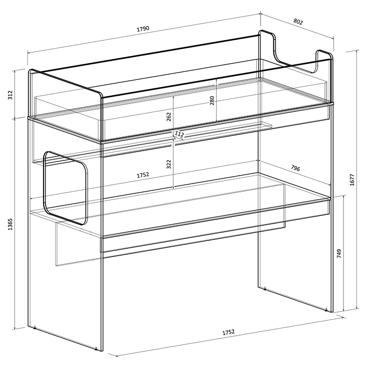 Учебная зона со столом под спальным местом открывает возможности для письменных работ,а также здесь удобно расположить ноутбук, а вместительная тумба поможет в хранеии канцелярских принадлежностей и учебников.